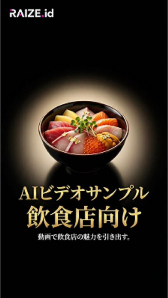 新鮮な海の幸をたっぷり使った海鮮丼を、AI映像で「食欲が湧く」ビジュアルに仕上げたプロモーション動画です。シズル感・ボリューム感・お店の雰囲気を短い尺の中でしっかり伝える構成になっています。飲食店のSNS広告や店内サイネージなどに最適なクリエイティブです。